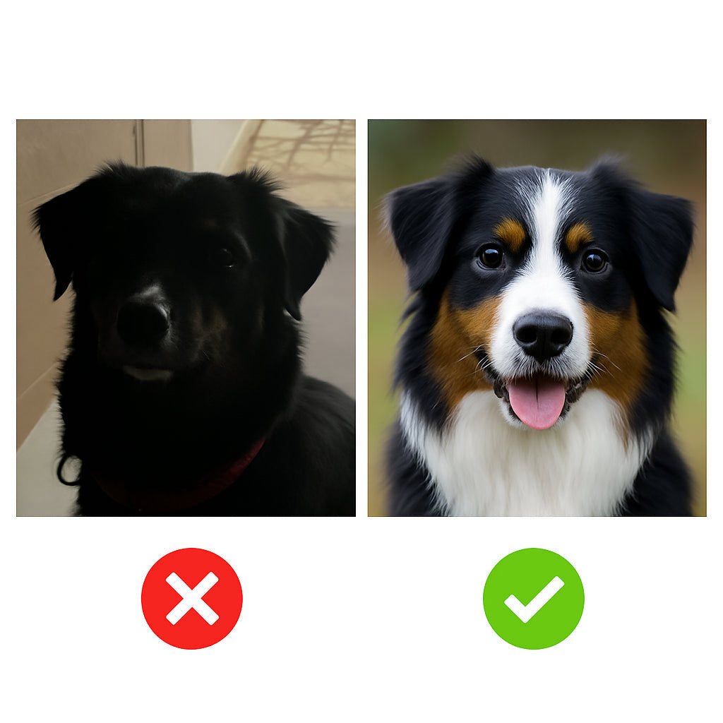 Si votre compagnon a un pelage sombre, privilégiez un éclairage uniforme. Cela évite les zones d’ombre et permet de faire ressortir chaque détail de son visage.